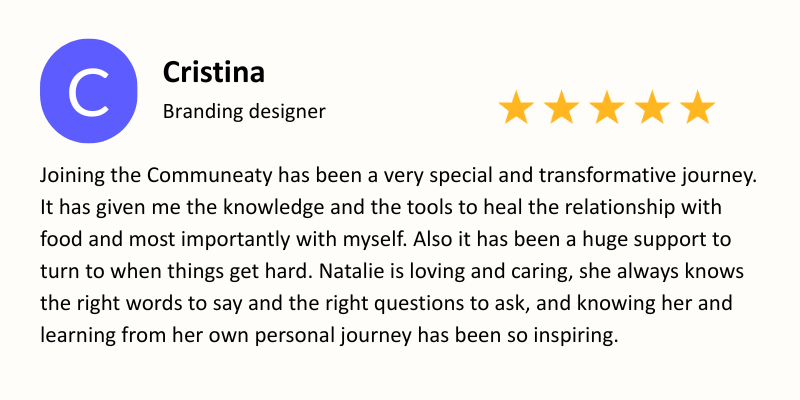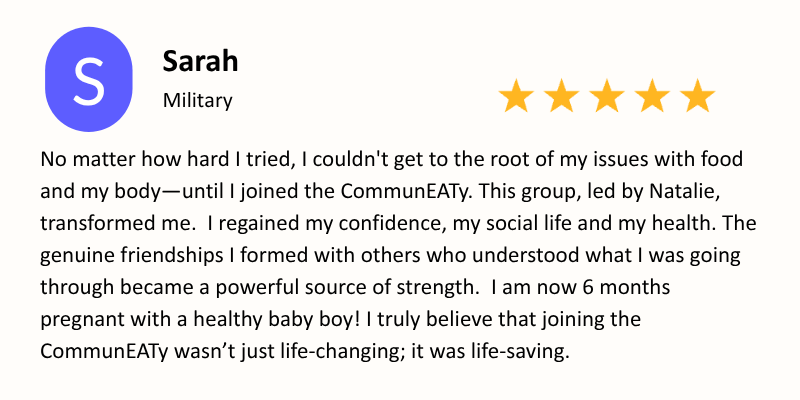 I totally get how nerve-wracking it can feel to join a group and be vulnerable around others! But don’t you think you’ve felt isolated for long enough? Based on the rapid progress I’ve seen in clients who work in a group setting, I exclusively offer group coaching in the CommunEATy. Believe me — group is where the real transformation happens!