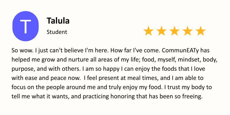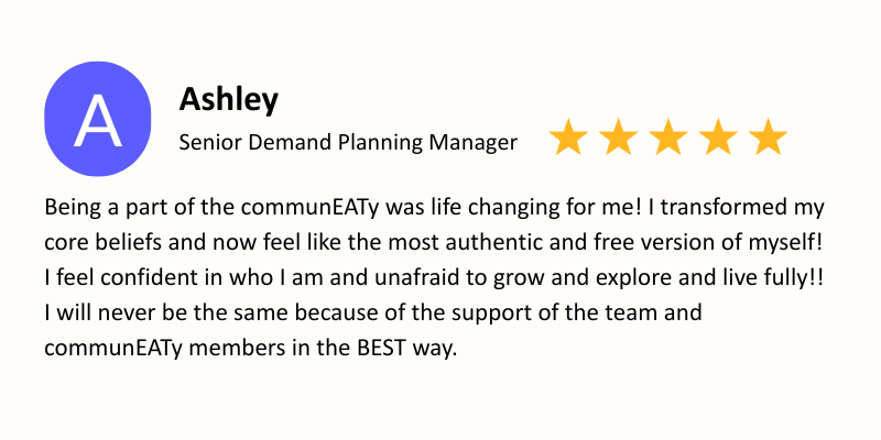 Note: Joining the CommunEATy does not require working with a therapist or dietitian. This program can serve as standalone support for individuals seeking to heal their relationship with food, body image and self-worth.